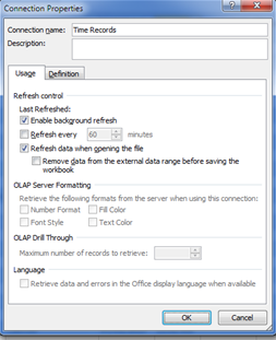 - Optionally, click Properties to set refresh, formatting, and layout options for the imported data, and then click OK. Choose a Refresh Option. It is recommended to check “Refresh Data when Opening the File”