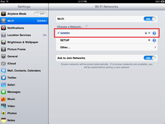 Once the wireless router has been set up, touch the Settings app and then touch Wi-Fi. Enter the network name and WEP key for wireless router that the server is connected to. There should be a check mark next to the name of the network if the connection was successful.