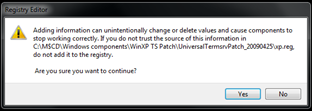 Go back to the UniversalTermsrvPatch_20090425 folder and click on the xp.reg if it’s a 32 bit system or vista.reg if it’s a 64 bit system. It’ll then prompt you with a dialogue box similar to the screenshot below warning you that you are about to make changes to the registry. Click yes, that you are sure that you want to continue.
