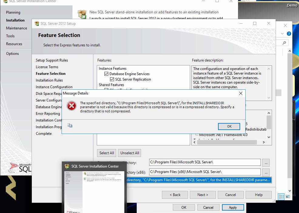 The specified directory, “C:\Program Files\Microsoft SQL Server\”, for the INSTALLSHAREDDIR parameter is not valid because this directory is compressed or is in a compressed directory. Specify a directory that is not compressed.