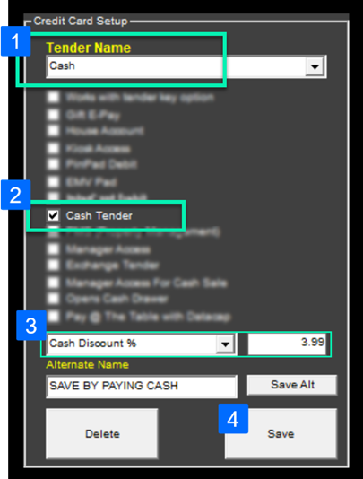 To use a discount name other than Cash Discount, type in a name under Alternate Name and then select Save Alt.