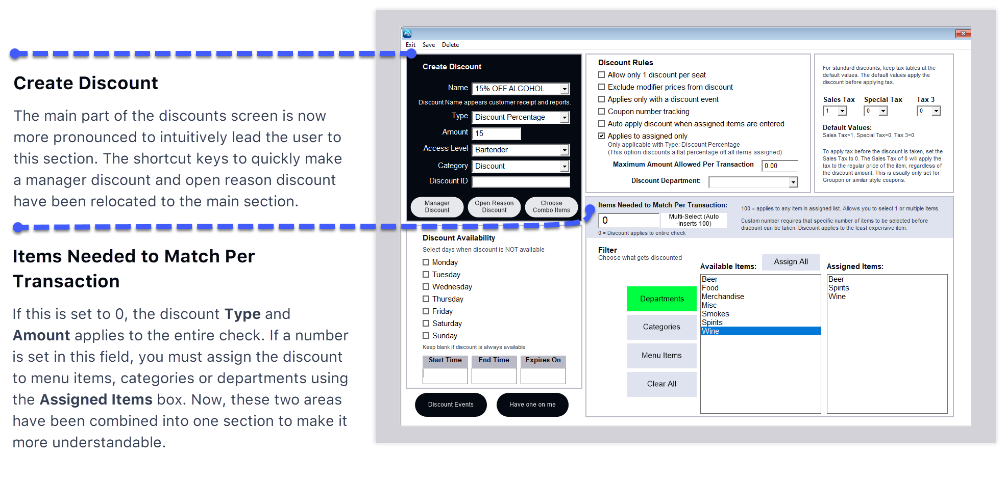 The components of the setup screen have been rearranged and sectionalized to better accommodate the steps a user must take to add or edit a discount. Sections now include titles, reworked descriptions, and helpful tips.