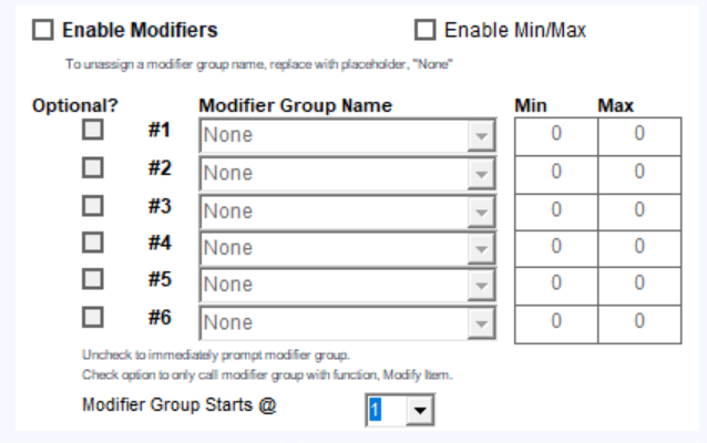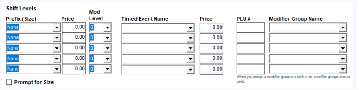 - The Modifier Group Name is now shown at the end and separately from the “Mod Level”, since these two options do not pertain to one another. A tip of, “When you assign a modifier group to a shift, main modifier groups are not used”. This was added to instruct the user that when the Modifier Group Names are blank in the shift level area, the main modifier groups are used.